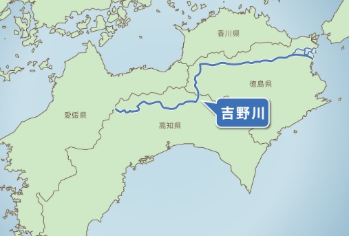 吉野川:高知県(源流・四国山地)→徳島県(河口・紀伊水道)を流れる。香川県の用水にも使われる。