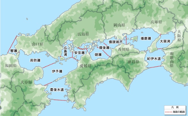 紀伊水道:和歌山県、徳島県、兵庫県淡路島によって囲まれる海域。東西南北50km