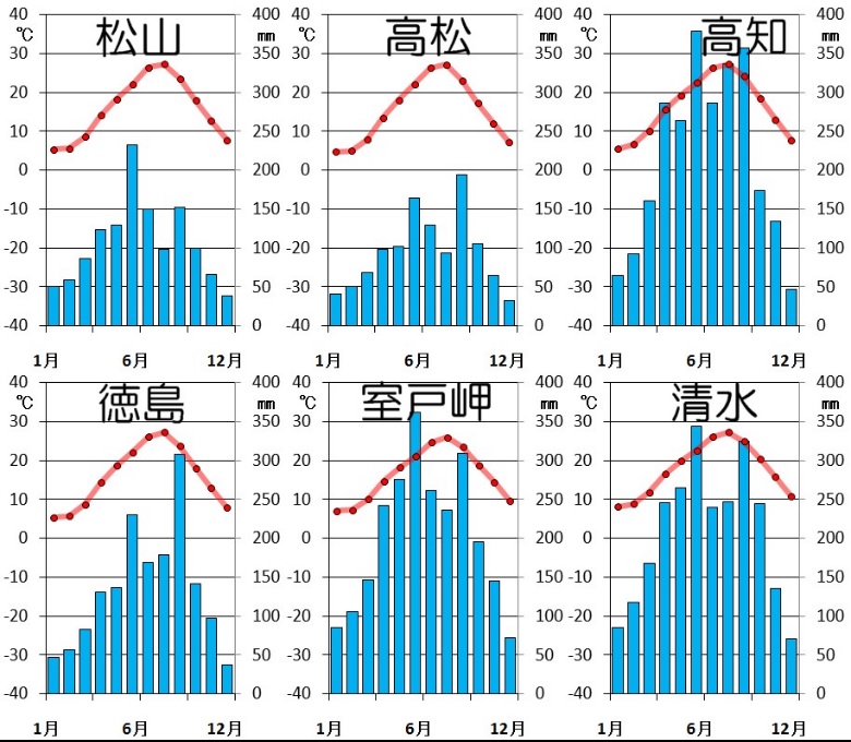 徳島県徳島市は、香川の高松市(少雨)や高知市の(多雨)のよう