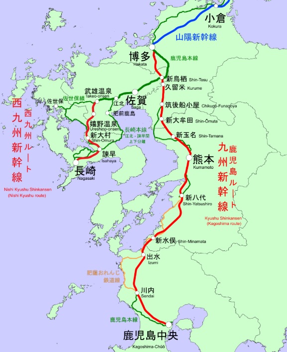 | 九州新幹線 | 博多~鹿児島中央。福岡~佐賀~熊本~鹿児島 |